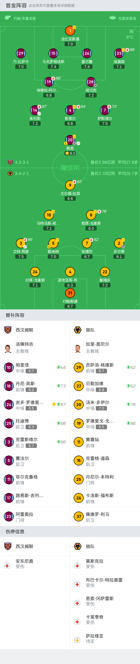西汉姆联的进球让狼队陷入被动,他们加大了进攻力度,试图扳平比分。然而,尽管在比赛的后半段,狼队展开了猛烈的攻势,但西汉姆联的防守稳固,一次次将对手的进攻化解。最终,比赛结束,西汉姆联以2-1的比分战胜了狼队,球迷们为球队的胜利欢呼。
